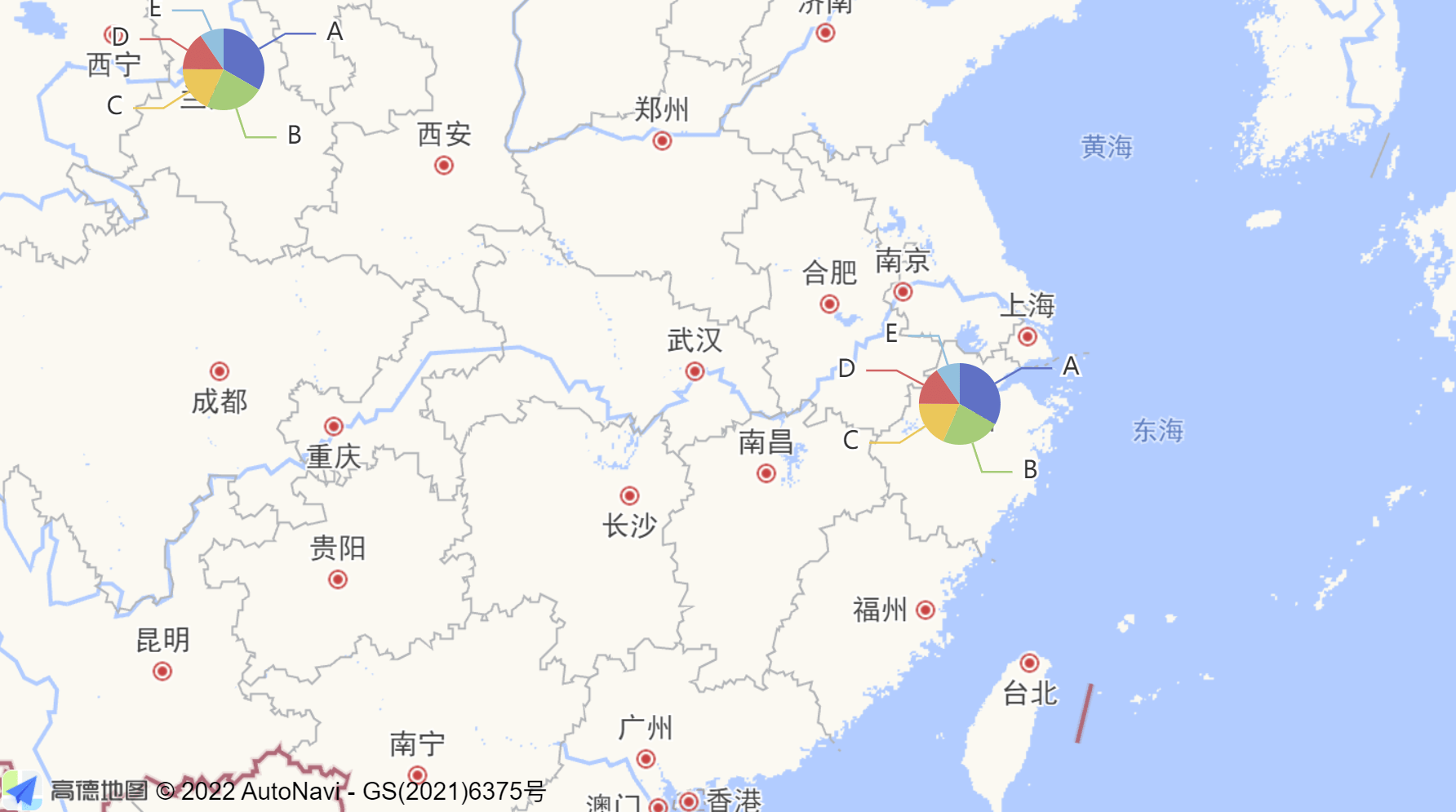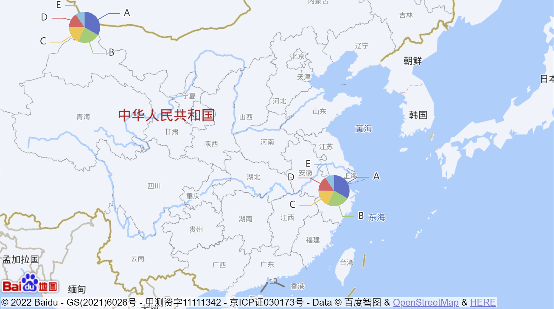 等等各种坐标系中,甚至可以和百度地图扩展联动,在地图上显示饼图: